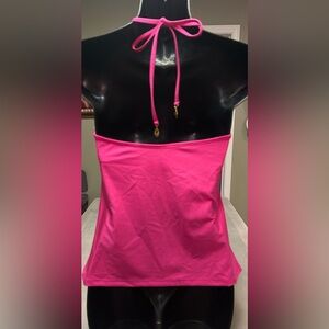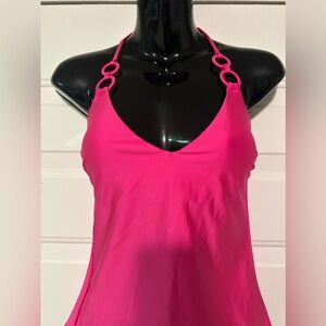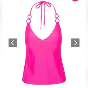 is flattering and ready for your next warm-weather getaway, featuring adjustable spaghetti strap halter straps, a V-neckline, fitted silhouette, and monochromatic ring connector detail at the straps. Create the perfect seamless look by pairing this bright tankini swim top with our matching bikini bottoms with flattering ring connectors at the sides.