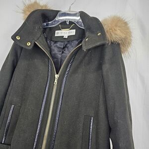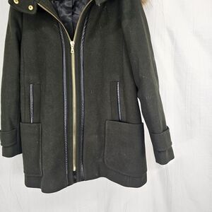 TRINA TURK WOMEN’S SIZE 6 OLIVE GREEN WOOL PEACOAT LEATHER TRIMMED ACCENTS FIR TRIMMED HOOD