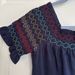 TRINA TURK Womens Navy Embroidered Smocked Short Sleeve Off Shoulder Tunic