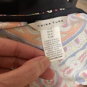 Elevate your beach day style with this stunning Trina Turk Nepal swim cover-up tunic mini dress. The black and tropical colors of the geometric print will make you stand out from the crowd. The dolman sleeves and slimming features of this lightweight and stretchy dress will make you feel comfortable and confident. This cover-up is made of spandex and nylon, making it perfect for lounging by the pool. It's a perfect fit for women who wear size M and have an up-to-C cup size. The main measurements is under bust-28- Length back neck to point-33 inches. The short sleeve design and above-the-knee length will provide the perfect amount of coverage for a chic and stylish look.
