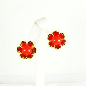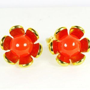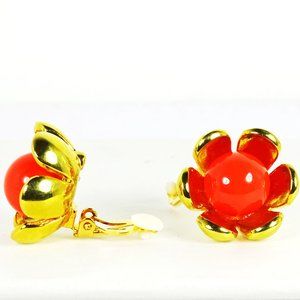Trina Turk gold plated and coral resin flower earrings are 7/8" diameter with clip on fastenings.