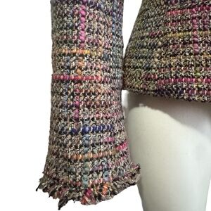Colorful Trina Turk mottled tweed cropped blazer. Undertones of gray with pink blue and gold contrast weave. Frayed fringe edges on lapel’s, along front and on cuffs. Completely lined in pink. Light shoulder pads. Beautiful condition.