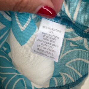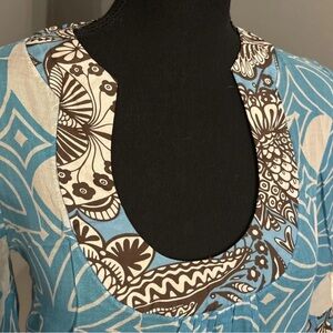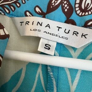 Embrace a relaxed style with this Trina Turk blouse, featuring a striking blue hue and graphic design. The 3/4 sleeves and tunic style offer a comfortable fit, perfect for casual outings. Crafted with attention to detail, this top adds a touch of sophistication to your wardrobe.