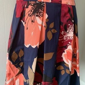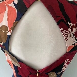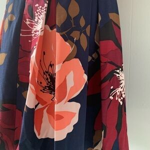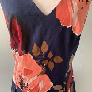 Trina Turk Devoted dress. Navy blue. Floral pattern; colors include white, maroon, pink, olive green, coral, and black. V-neckline. Sleeveless. Key hole back, top clasp closure. Back hidden zipper, gold hardware. Navy blue lined interior, lace perimeter. Pleated skirt. Truly a gorgeous dress. Womens size 6. New with tags.