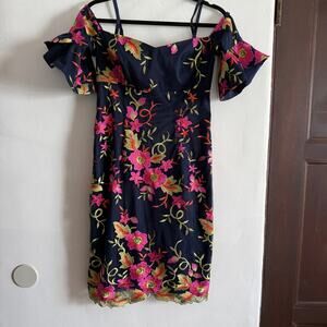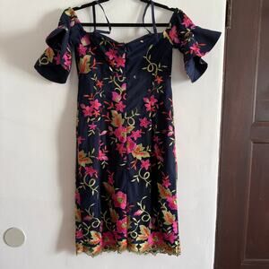 TRINA Trina Turk | Ivar Navy Blue Embroidered Floral Off Shoulder Sheath Dress