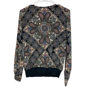 2 button cuff long sleeves. Elegant paisley print in jewel tones.