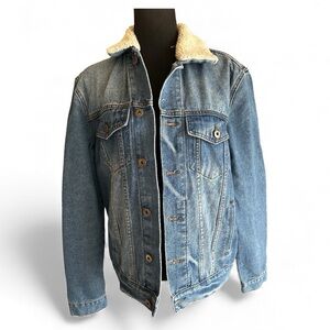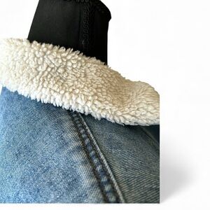 Trendy TRICOT LOS ANGELES shearling lined denim jacket. Features a cozy cream sherpa collar, front button and multiple pockets Ideal for stylish warmth.