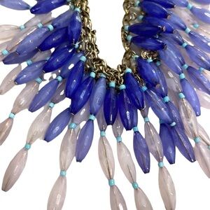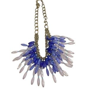 Triple layered statement necklace 2 shades of blue and white beads Gold tone metal Adjustable Max length 13”