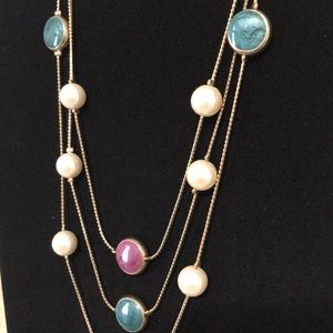 Gorgeous gold tone, three level necklace with mauve, green and pearl colors. Costume jewelry.