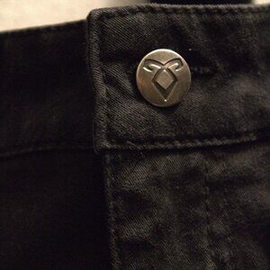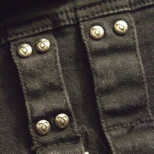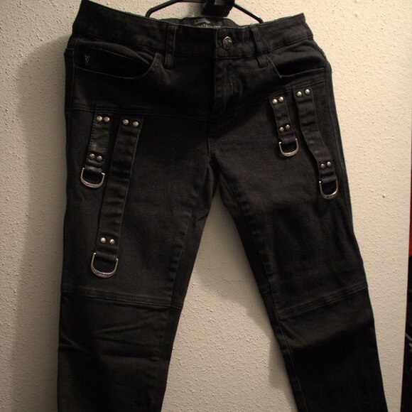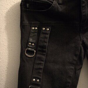 Used jeans, slightly faded but with no other issues. Women’s black gothic grunge skinny jeans by Tripp NYC.
