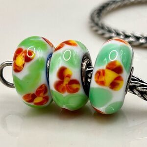 Trollbeads Red & Yellow Flowers over Green & White Opaque and then over Translucent Pink