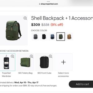 GREAT CONDITION, BARLY USED, TROPIC FEEL SHELL BACKPACK WITH DETACHABLE TOILETRY KIT. CHECK THEIR WEBSITE. ORIGINAL PRICE WAS $309.00. 35 Liters but with Kangaroo Pouch opened (for shoes) it expands to 40 Liters. Notice hidden Kangaroo Pouch that comes out when needed or stows away when not needed. It’s my favorite feature. https://shop.tropicfeel.com/products/shell-backpack