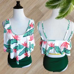 TROPICAL PRINT RUFFLE TWO PIECE SWIMSUIT
