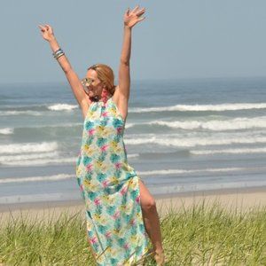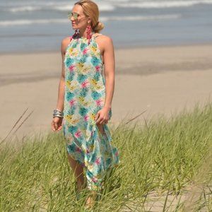 GRAB THIS FABULOUS TROPICAL PRINT SHEER SWIMSUIT COVERUP, THIS COULD ALSO WE WORN AS A DRESS WITH A SLIP UNDERNEATH. SLITS ON SIDES, LIGHT WEIGHT.