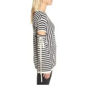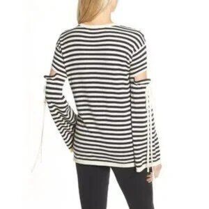Trouve Black and Cream Striped Pullover Crew Neck Sweater with Cutout Sleeves