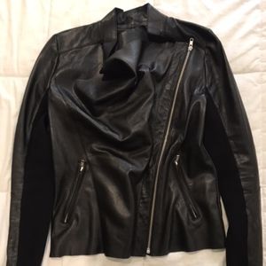 Supple black leather. Two looks in one, can be worn open with drape neck or zipped up to show zippers. Rib-knit sleeves create a snug fit, with zip-gusset cuffs. Fit is true to size. No flaws.