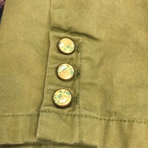 Army/olive green blast with 3 front pockets, lots of details and plenty of character! Hidden pockets, colorful lining, big blue buttons! Great condition, no flaws. 36" Bust 20" length