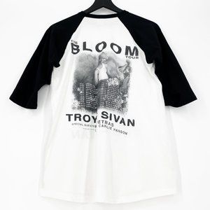 Troye Sivan 2018 The Bloom Concert Tour Shirt is the collectible tee for Sivan's US tour with Kim Petras, Leland and Carlie Hanson. This 2018 The Bloom Tour Shirt is 100% cotton, quarter sleeves on a baseball tee. Front of the shirt has bold caps with "The Bloom & Troye Sivan" with his portrait. Back of the shirt has "The Bloom Tour, Concert dates with states and featured guests" along w/ his portrait within a floral background.