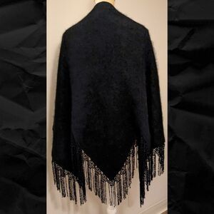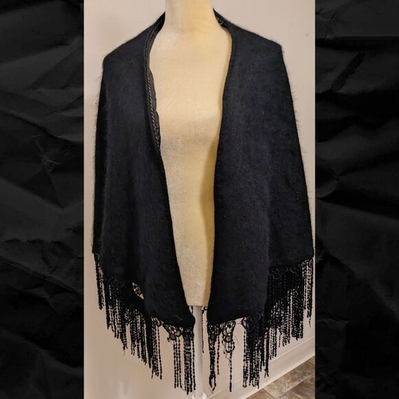 Shannan Vintage Angora Shawl - EUC - Absolutely gorgeous fringed shawl in a rich Angora blend. Lace fringes adds an extra feminine touch. Hem is staggered. Fully lined. This is a vintage garment so the lace shows some wear which is not noticeable upon wearing. 50% acrylic, 35% angora, 10% nylon and 5% wool. Size M.