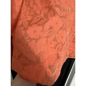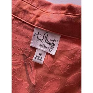 This is a True Beauty by Emme women's blouse in size 18. It is an orange button-up shirt tunic made of 100% cotton with a collared neckline and long roll tab sleeves. The blouse features pockets, side slits at the hem, and has a lightweight feel. It is a stylish and comfortable piece for casual or semi-formal occasions.