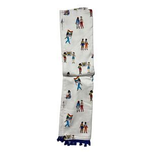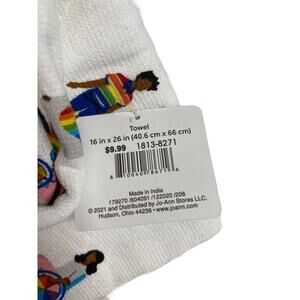 TRUE COLORS New-with-tags Human Decorative Hand Towel. Rainbow Pride theme. 16x26 in. 100% Cotton. Blue fringe at edge of towel. Manufactured by Jo-Ann Stores. Cute people print with various pride flags and designs.