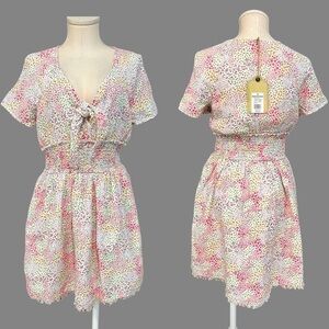TRUE CRAFT NEW smocked elastic waist short sleeve mini dress with chest bow tie