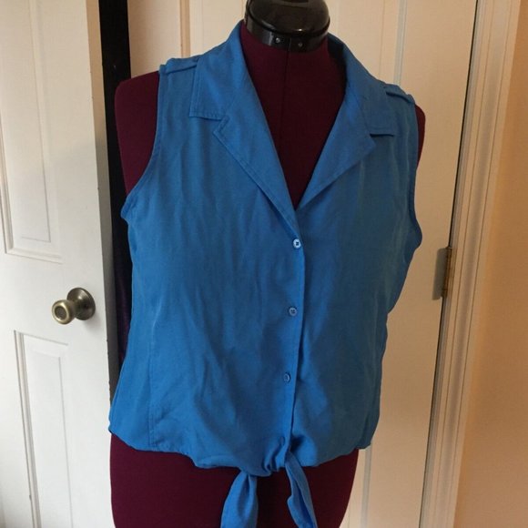 TRUE FREEDOM JUNIOR'S SIZE XL BLUE SLEEVELESS BLOUSE. BUTTONS UP AND TIES AT THE WAIST. 100% POLYESTER, MACHINE WASHABLE.
