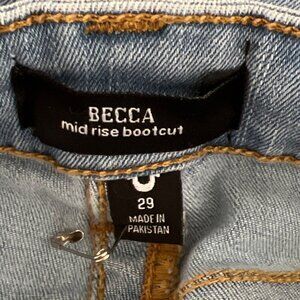 New with tags. Becca mid-rise boot cut jeans in light wash. Factory distressed and aged. Classic 5 pocket style; zip/button closure; contrasting thread. Cotton/Polyester/Elastane. Machine wash. Top of waist approx 14.5" across, 9" rise, 32" inseam. Cuffs measure approx 8.5 seam to seam when lying flat.