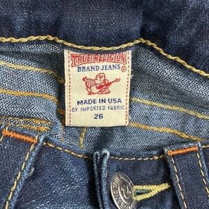 TRUE RELIGION Big T Flare Leg Low Rise Jeans Size 26 Dark Wash Boho Casual. Excellent pre-owned condition.