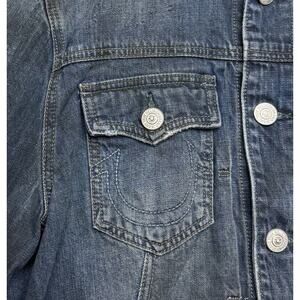 TRUE RELIGION Dylan Distressed Denim Trucker Jacket Flap Pockets Indigo Mens L