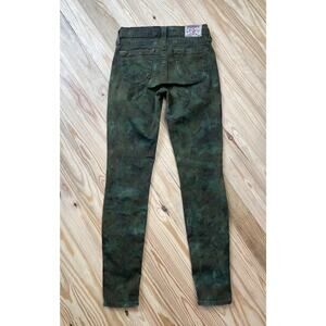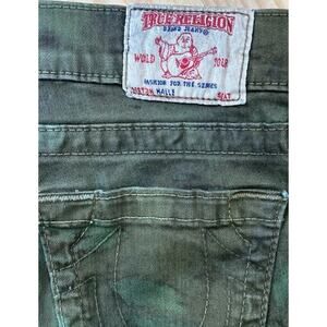 The product is a pair of True Religion Halle skinny jeans in a camouflage pattern, size 27. Made in the USA, these green jeans feature a faded look and a sleek skinny style. With a regular fit and a 29.5-inch inseam, they are designed for women who appreciate both fashion and quality craftsmanship. Perfect for those who love the True Religion brand and want to make a statement with their wardrobe choice.