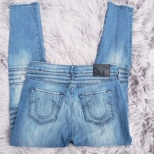 You are looking at a beautiful pair of TRUE RELIGION HALLE mid rise super skinny faded Moto jeans with Distressed and lightly embroidered details.