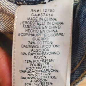 Distressed as intended. Some areas look dirtied and worn, all as intended. See photos for best description, material tag and measurements. Nice soft denim feels like its very broken in, no stiff... Cotton blend.