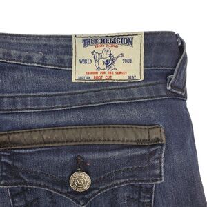 TRUE RELIGION Jeans Womens 31 Blue Leather Accent Flap Pockets Designer Bootcut