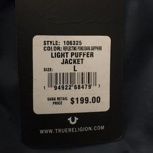 TRUE RELIGION TWO-TONE (GREEN/NAVY) LIGHT PUFFER JACKET. MENS - SIZE LG - TAGS STILL ON - NEVER WORN!