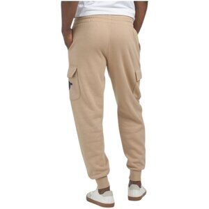elastic drawstring waist, ribbed cuffs, brand logo accent, fleece lined