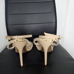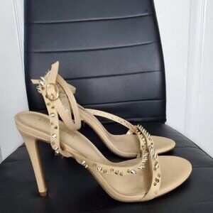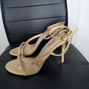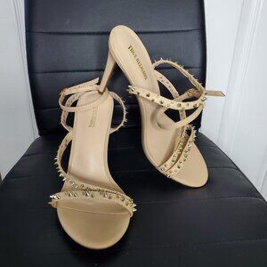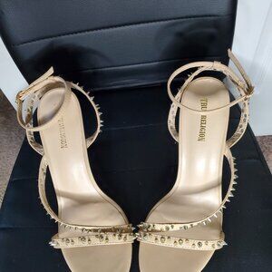 True Religion nude strappy heels featuring gold spike embellishments (or silver depending on the angle) and a sleek stiletto heel. The soft nude tone keeps them elegant, while the metallic studs add just the right amount of edge. Perfect for a night out or to elevate a simple look.