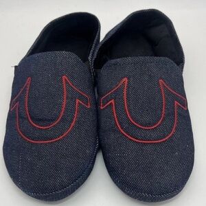TRUE RELIGION Slippers Mens Size 9 - 10 Blue Denim Red Logo Slip On Hard Bottom