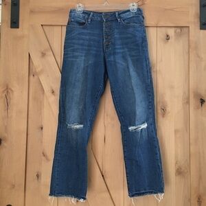 TRUE RELIGION Starr high rise distressed cropped jeans. Size 27. Features raw hem and button fly. Laying flat, waist measurement is approximately 14 inches. Rise is approximately 10.25 inches. Inseam is approximately 25 inches.
