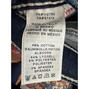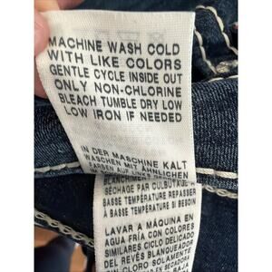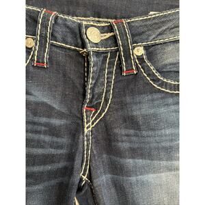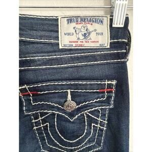 The TRUE RELIGION VTG 27 Skinny Flap Dream Eater Low Rise Jeans are vintage women's jeans with a dark wash and white stitching accents, featuring a low rise and skinny style. Made from a cotton blend denim material, these jeans showcase the iconic True Religion branded logo and are designed with a 30-inch inseam. The Y2K 90s theme adds a unique touch to these stylish and on-trend denim pants, perfect for any fashion-forward individual looking to make a statement.