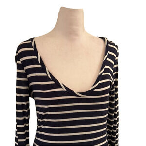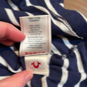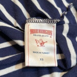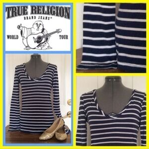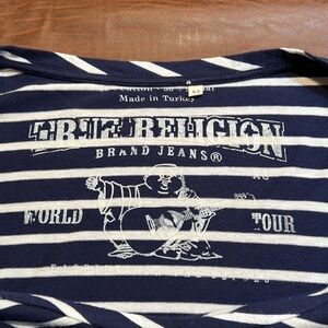 TRUE RELIGION Vintage “World Tour” Navy Blue & Cream Stripe Long Sleeve Tee Shirt Size XS