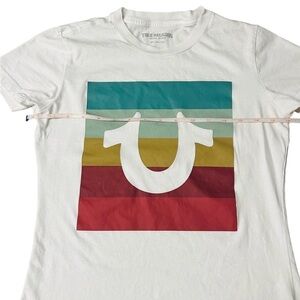 TRUE RELIGION WHITE SHORT SLEEVE FITTED TEE SIZE SMALL WITH COLORFUL LOGO