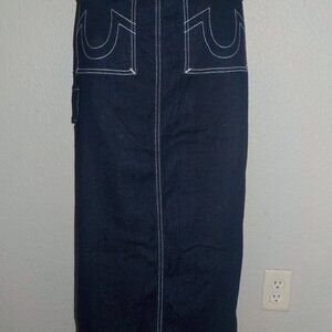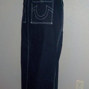 TRUE RELIGION WOMENS SIZES CARGO DARK WASH WHITE TOP STITCHED MAXI DENIM SKIRT