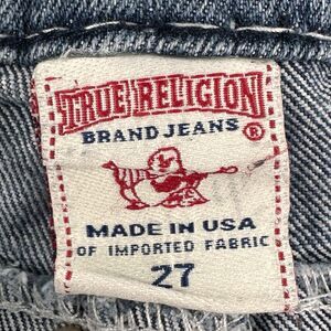 -TRUE RELIGION - Women's Size 27 World Tour Joey Super T Blue Jeans, COMES AS IT IS PICTURED, SEE PICTURES FOR MEASUREMENTS AND IMPERFECTIONS. PLEASE NOTE ZIPPER MAY NEED TO BE FIXED AS THE BOTTOM PART IS LOOSE. HAS SOME LOOSE THREADINGS.