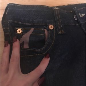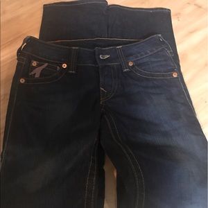 True religion, straight leg dark denim jeans. Size 27 waist. Not "skinny jeans "certainly not boot cut. Still very fitted in thighs and butt looks amazing! New without tags have only been tried on but never worn out. I thought I would hem them but the Tailor said with how short I am he basically have to cut them off at the knee- or I have to wear 6 inch + heels with them