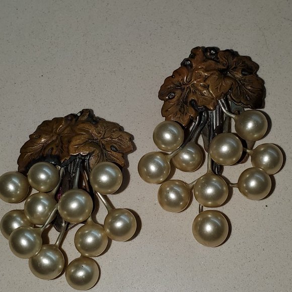 THIS IS A PAIR OF TRUE VINTAGE DRESS CLIPS WHICH I BELIEVE DATE TO THE 1940'S. THEY FEAUTURE FAUX PEARLS WITH A LEAF DESIGN AND ARE IN VERY GOOD VINTAGE CONDITION. THEY MEASURE 1-3/4".