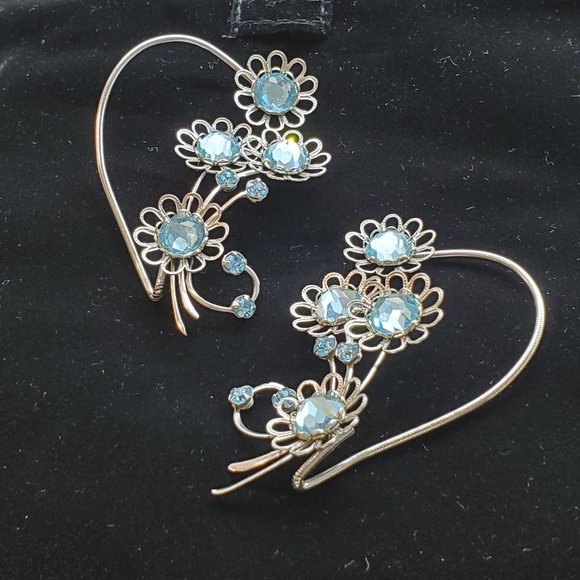 THIS IS A PAIR OF TRUE VINTAGE EAR HUGGERS IN EXCELLENT CONDITION. I WOULD SAY THESE DATE TO THE 1950'S OR 1960'S. THEY ARE DONE IN A SILVER TONE AND ACCENTED WITH BLUE STONES.