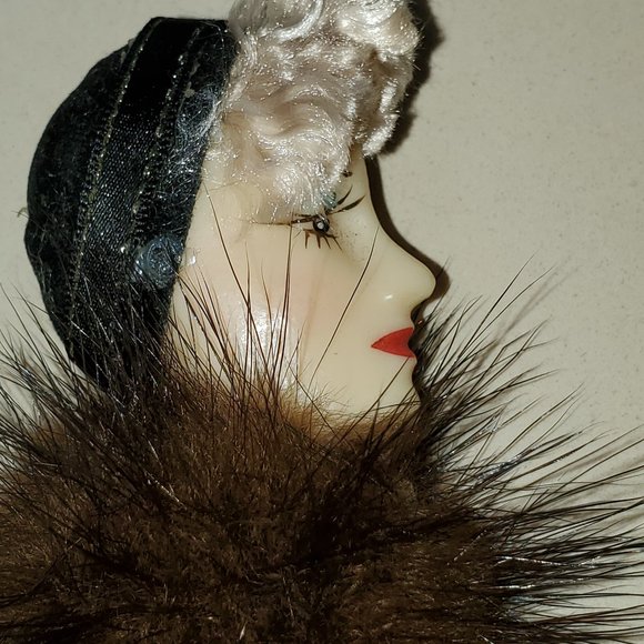 THIS IS A TRUE VINTAGE LADY PIN THAT FEATURES A FUR COLLAR, RED LIPS AND FAKE HAIR, IT IS ONE OF THE NICEST ONES I HAVE SEEN. IT MEASURES 3" IN LENGTH AND IS IN VERY GOOD VINTAGE CONDITION. PLEASE NOTE THAT I HAVE ANOTHER LADY PIN IN MY CLOSET FOR SALE. I KNOW A LOT OF PEOPLE COLLECT THESE PINS.