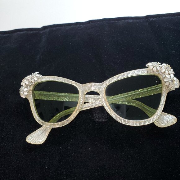THIS IS A PAIR OF TRUE VINTAGE SUNGLASSES FEATURING A FLOWER DESIGN DETAIL. THE CONDITION IS GOOD. THE ARMS MEASURE 5-1/8".