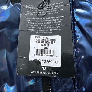 The TRUE RELIGION men's bomber jacket in navy features a stunning iridescent finish that catches the light beautifully. Designed in size XL, this fashion-forward jacket combines style and comfort, making it perfect for any casual outing. Elevate your wardrobe with this trendy statement piece! #TrueReligion #BomberJacket #Fashion